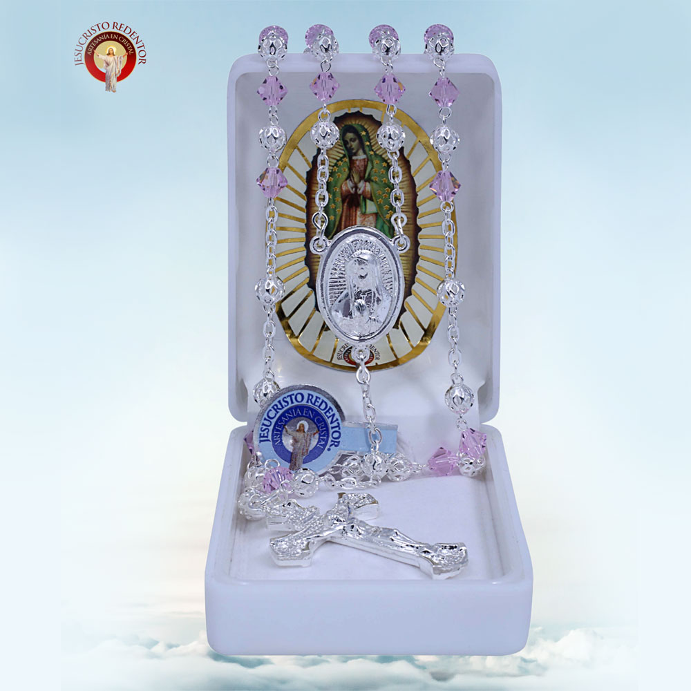 R073-9 ROSARIO CRISTAL CORTADO #6 ROSA C/FILIGRANA PLATA